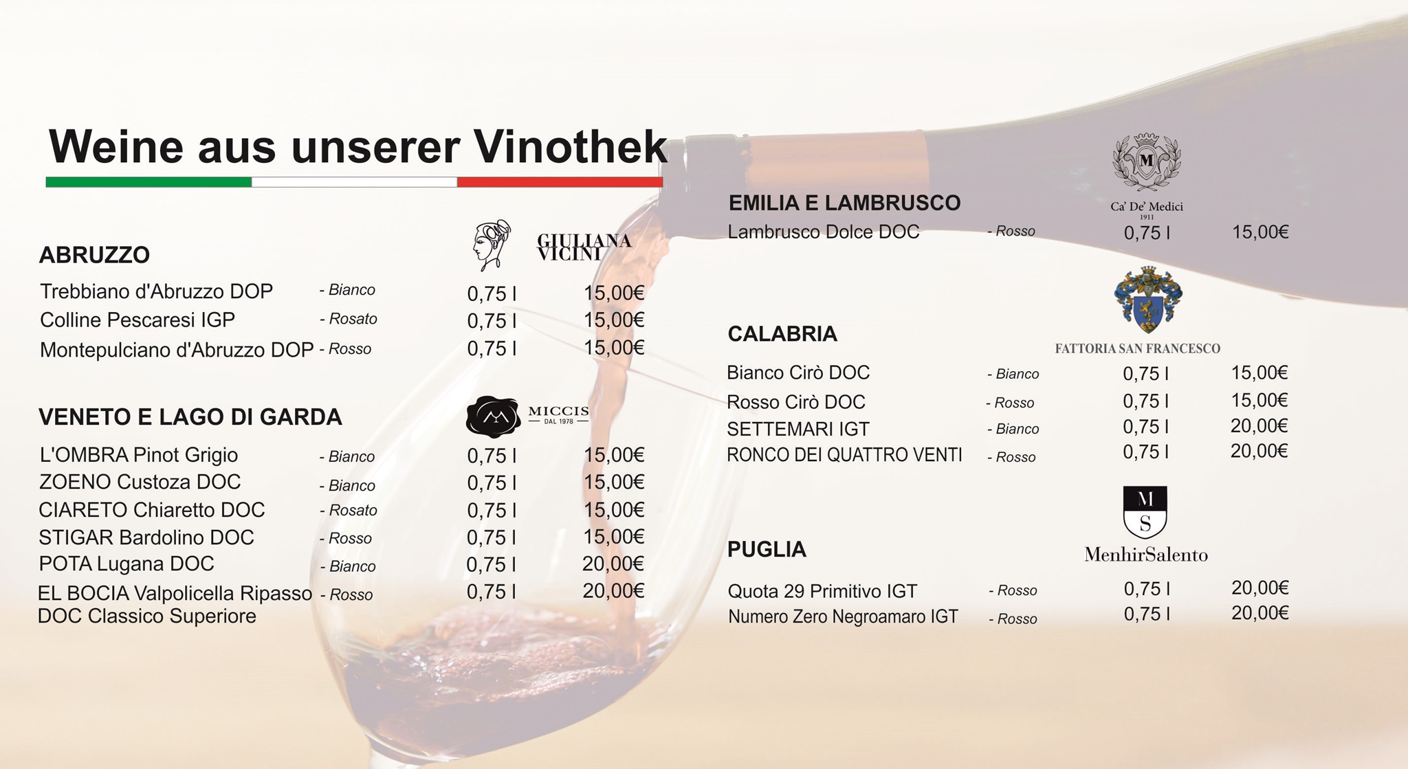 Unsere Vinothek ist der perfekte Ort, um einen gemütlichen Abend mit Freunden oder Familie zu verbringen. Genießen Sie ein Glas Chianti oder Prosecco und lassen Sie sich von unserem freundlichen Personal beraten, um den perfekten Wein für Ihren Geschmack zu finden.